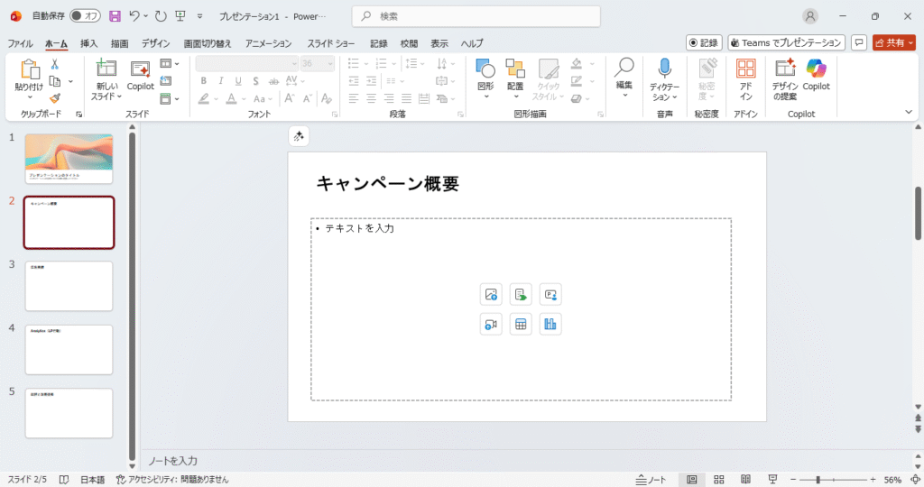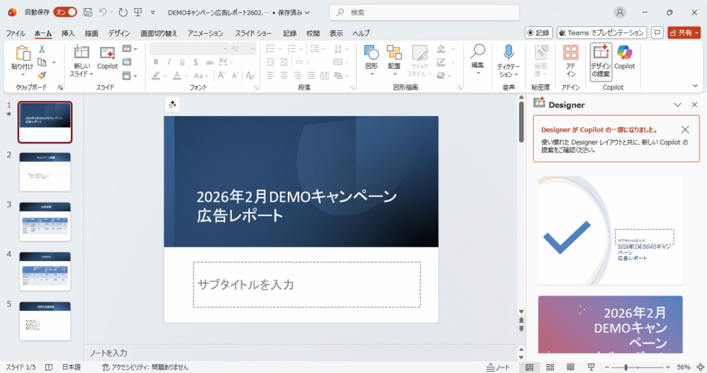 そのためPowerPointの デザイン提案(Designer) を使用します。